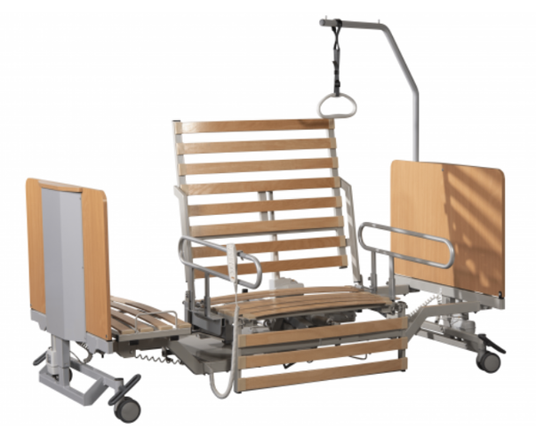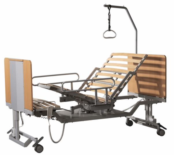 Le Multidorm Mobil est parfait pour une utilisation rapide dans les soins à domicile. Il se déplie et se replie électriquement sur simple pression d'un bouton et peut être rangé de manière peu encombrante. Grâce à la solution brevetée du logement des montants latéraux, aucun outil n'est nécessaire pour monter et démonter le lit.